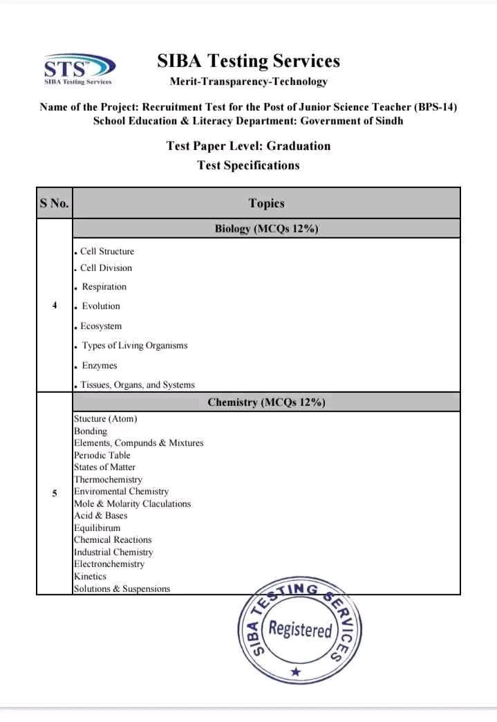 SIBA Testing Services JST Syllabus – Sindh Study Hub All subjects complete MCQs by sequence