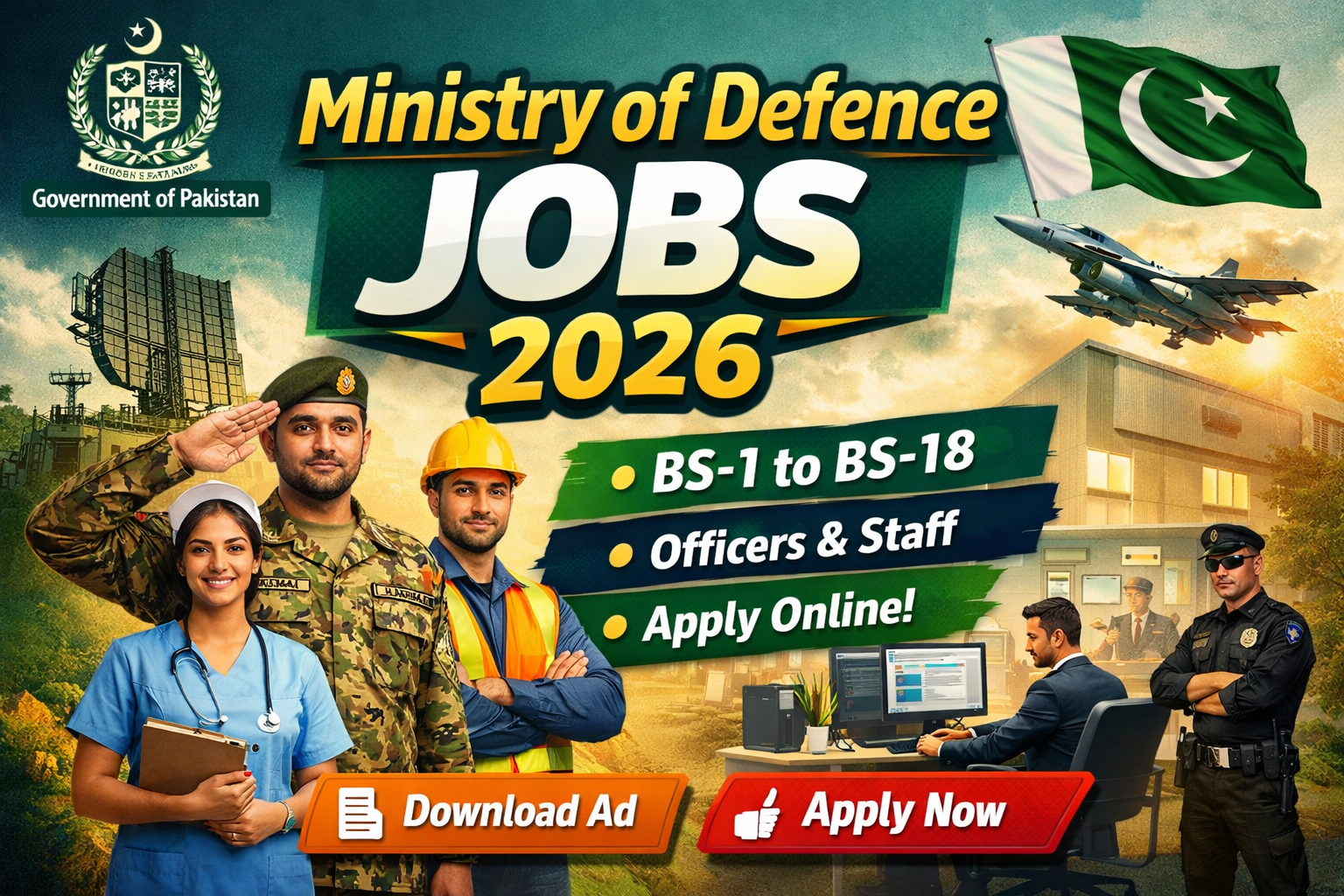 The Government of Pakistan – Ministry of Defence (MoD) has announced latest government jobs for 2026. These vacancies are available for BS-1 to BS-18 and include officers, technical staff, medical staff, clerical positions, and skilled workers.